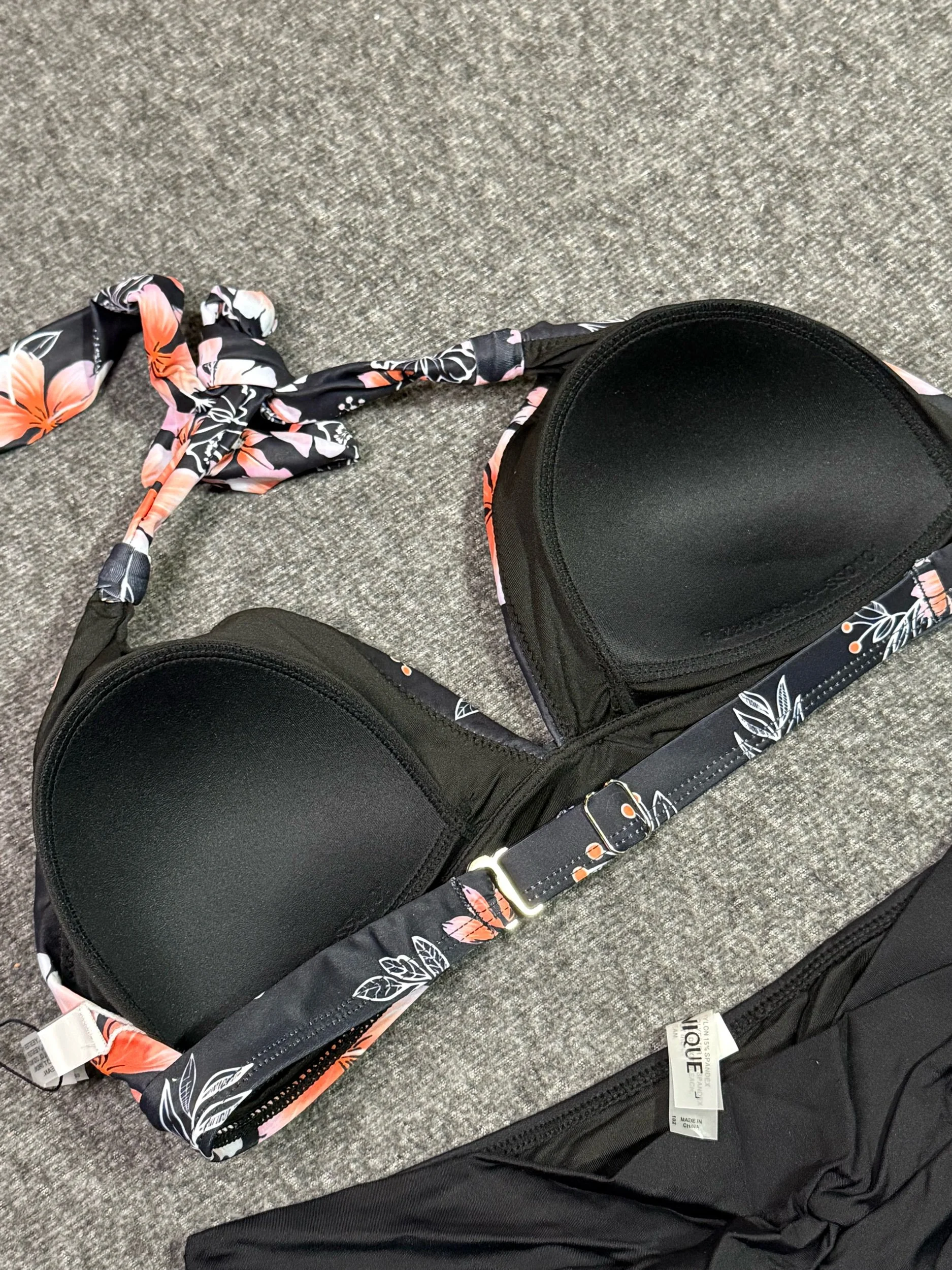 This bathing suit is new and unused. Featuring a bold and vibrant black and orange floral pattern, it brings a fun and stylish look to your swimwear collection. The high-waisted bottoms provide flattering coverage while accentuating your natural shape, and the coordinating top offers comfortable support for all-day wear.